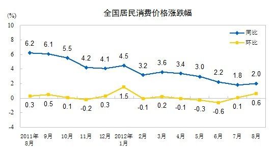 2012年8月份,全國居民消費價格總水平同比上漲2.0%。其中,城市上漲2.1%,農(nóng)村上漲1.8%;食品價格上漲3.4%,非食品價格上漲1.4%;消費品價格上漲2.1%,服務(wù)項目價格上漲2.0%。1-8月平均,全國居民消費價格總水平比去年同期上漲2.9%。