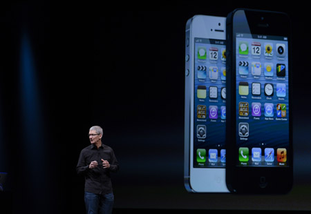 9月12日,在美國舊金山舉行的發(fā)布會上,蘋果公司首席執(zhí)行官蒂姆·庫克介紹新一代手機iPhone 5的特性。當天,美國蘋果公司發(fā)布新一代智能手機iPhone 5。 市場研究公司IHS日前發(fā)布的一份分析報告指出,蘋果手機今年第二季度銷量比前一季度大幅下降,一個重要原因是大批消費者為等待新產(chǎn)品上市而推遲購買。該公司專家認為,iPhone5上市后將會刺激蘋果手機的銷售在今年最后幾個月出現(xiàn)反彈,并有望對推動全球智能手機銷量增長做出貢獻。