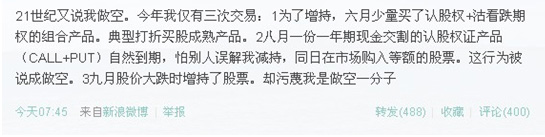 他詳細(xì)表述稱:“1.為了增持,六月少量買了認(rèn)股權(quán)+沽看跌期權(quán)的組合產(chǎn)品。典型打折買股成熟產(chǎn)品。2。八月一份一年期現(xiàn)金交割的認(rèn)股權(quán)證產(chǎn)品(CALL+PUT)自然到期,怕別人誤解我減持,同日在市場購入等額的股票。這行為被說成做空。3。九月股價大跌時增持了股票。卻污蔑我是做空一分子”。