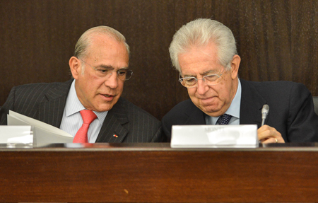 24日,經(jīng)合組織秘書長葛利亞和意大利總理蒙蒂在羅馬商討意大利的結(jié)構(gòu)改革問題。葛利亞表示,蒙蒂提出的改革必須堅(jiān)持下去,不能走回頭路,這對歐元區(qū)國家至關(guān)重要。經(jīng)合組織的一份最新報(bào)告表示,政府的改革將在未來十年給意大利的GDP加上四個(gè)百分點(diǎn)。蒙蒂則樂觀地表示,最近一年進(jìn)行改革后的意大利,不再威脅歐元區(qū)穩(wěn)定。