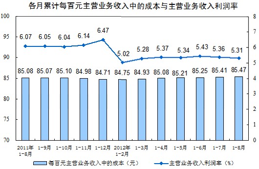 規(guī)模以上工業(yè)企業(yè)實(shí)現(xiàn)主營(yíng)業(yè)務(wù)收入576398億元,同比增長(zhǎng)10.2%。每百元主營(yíng)業(yè)務(wù)收入中的成本為85.47元,主營(yíng)業(yè)務(wù)收入利潤(rùn)率為5.31%。