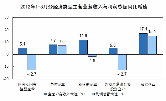 1-8月份,在規(guī)模以上工業(yè)企業(yè)中,國(guó)有及國(guó)有控股企業(yè)實(shí)現(xiàn)利潤(rùn)8839億元,同比下降12.7%;集體企業(yè)實(shí)現(xiàn)利潤(rùn)485億元,同比增長(zhǎng)7%;股份制企業(yè)實(shí)現(xiàn)利潤(rùn)17814億元,同比下降1.9%;外商及港澳臺(tái)商投資企業(yè)實(shí)現(xiàn)利潤(rùn)7034億元,同比下降12.7%;私營(yíng)企業(yè)實(shí)現(xiàn)利潤(rùn)9454億元,同比增長(zhǎng)15.1%。