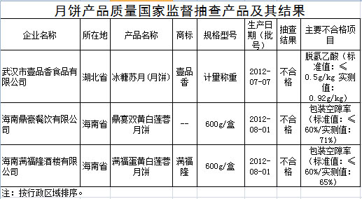 國家質(zhì)檢總局今日在其官網(wǎng)公布了2012年月餅產(chǎn)品質(zhì)量國家監(jiān)督抽查結(jié)果。結(jié)果顯示,本次共抽查320種月餅產(chǎn)品,壹品香、滿福隆等3種月餅不符合標(biāo)準(zhǔn)規(guī)定,不合格項(xiàng)目主要涉及脫氫乙酸、包裝空隙率項(xiàng)目。