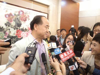 10月11日,作家莫言(左一)在獲諾貝爾文學(xué)獎(jiǎng)后在山東高密接受媒體采訪。當(dāng)日,瑞典文學(xué)院宣布將2012年諾貝爾文學(xué)獎(jiǎng)授予中國作家莫言。