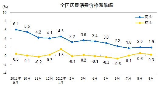 2012年9月份,全國居民消費(fèi)價格總水平同比上漲1.9%。其中,城市上漲2.0%,農(nóng)村上漲1.7%;食品價格上漲2.5%,非食品價格上漲1.7%;消費(fèi)品價格上漲1.8%,服務(wù)項目價格上漲2.3%。1-9月平均,全國居民消費(fèi)價格總水平比去年同期上漲2.8%。