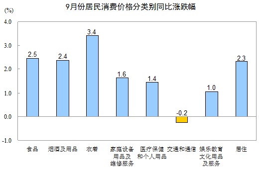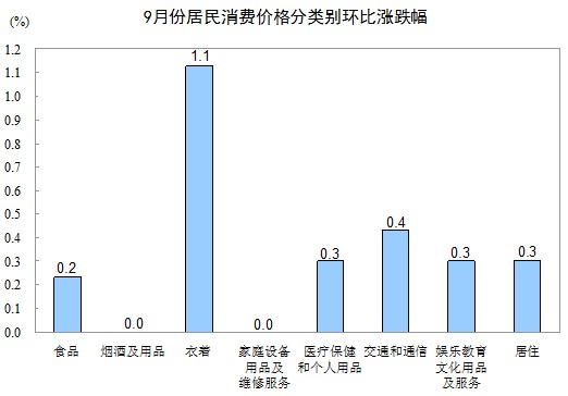 9月份,非食品價格環(huán)比上漲0.4%。其中,衣著、交通和通信、居住、醫(yī)療保健和個人用品、娛樂教育文化用品及服務(wù)價格分別上漲1.1%、0.4%、0.3%、0.3%和0.3%;煙酒及用品、家庭設(shè)備用品及維修服務(wù)價格持平(漲跌幅度為0)。居住中,水、電、燃料價格上漲0.3%。