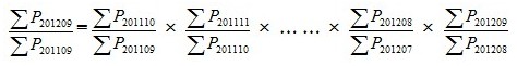 3、同比價(jià)格指數(shù)的計(jì)算方法。由于部分城市用以計(jì)算同比價(jià)格指數(shù)的基期網(wǎng)簽數(shù)據(jù)缺失,故不能計(jì)算2012年10月前各月與網(wǎng)簽數(shù)據(jù)同一口徑的同比價(jià)格指數(shù)。為保持同比價(jià)格指數(shù)計(jì)算和發(fā)布的連續(xù)性和穩(wěn)定性,滿足有關(guān)方面的需要,國(guó)家統(tǒng)計(jì)局采用有關(guān)房?jī)r(jià)統(tǒng)計(jì)數(shù)據(jù)和按網(wǎng)簽數(shù)據(jù)計(jì)算的房?jī)r(jià)數(shù)據(jù),根據(jù)同比指數(shù)和環(huán)比指數(shù)之間的數(shù)學(xué)關(guān)系,對(duì)9月份同比價(jià)格指數(shù)的計(jì)算進(jìn)行了技術(shù)處理:將2011年10—12月的環(huán)比數(shù)據(jù)連乘再乘以今年1—9月的環(huán)比數(shù)據(jù)生成本月同比價(jià)格指數(shù)。以此類推可計(jì)算其他月份的同比價(jià)格指數(shù)。計(jì)算公式表示為: