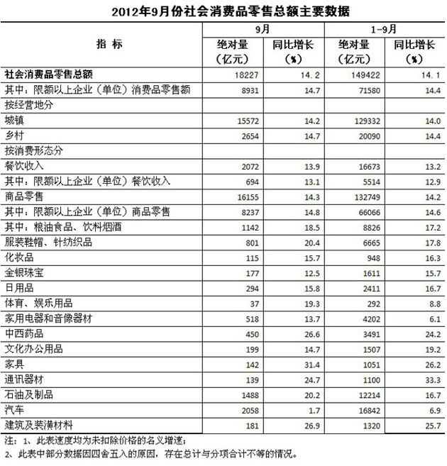 2012年9月份,社會消費品零售總額18227億元,同比名義增長14.2%(扣除價格因素實際增長13.2%,以下除特殊說明外均為名義增長)。其中,限額以上企業(yè)(單位)消費品零售額8931億元,增長14.7%。1-9月份,社會消費品零售總額149422億元,同比名義增長14.1%(扣除價格因素實際增長11.6%)。從環(huán)比看,9月份社會消費品零售總額增長1.46%。