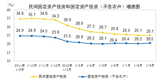 2012年1-9月份,全國民間固定資產(chǎn)投資159412億元,同比名義增長25.1%(扣除價格因素實(shí)際增長23.4%),增速與1-8月份持平。民間固定資產(chǎn)投資占固定資產(chǎn)投資的比重為62%,比1-8月份下降0.1個百分點(diǎn)。