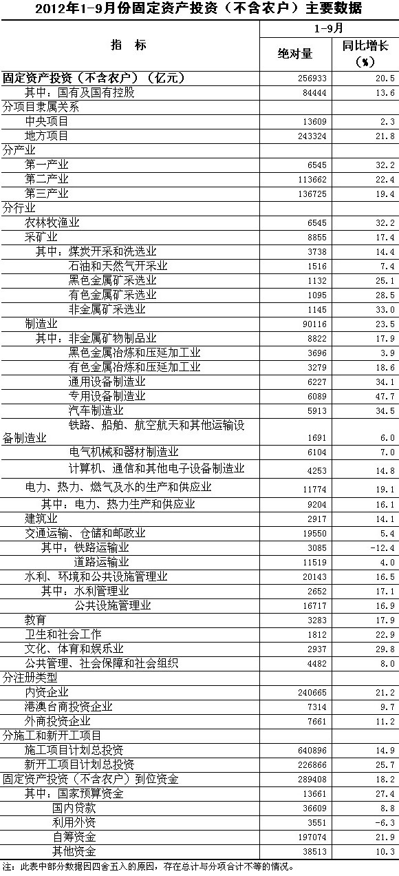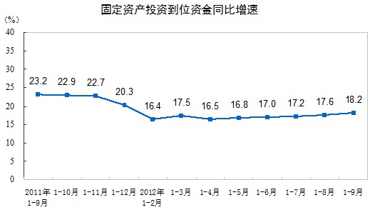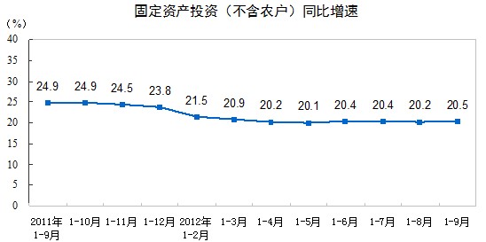 2012年1-9月份,全國固定資產投資(不含農戶)256933億元,同比名義增長20.5%(扣除價格因素實際增長18.8%),增速比1-8月份提高0.3個百分點。從環(huán)比看,9月份固定資產投資(不含農戶)增長1.63%。