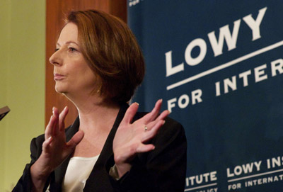 圖為澳大利亞總理吉拉德當(dāng)天發(fā)表講話,她說:“亞洲正走在重返全球經(jīng)濟(jì)和政治主導(dǎo)地位的道路上。這(趨勢)不僅不可阻擋,而且正在加速!