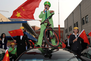 陳光標站在汽車上,舉騎自行車倡議綠色出行。當日,江蘇黃埔再生資源公司董事長陳光標在南京為他的部分微博粉絲在“反日游行”中被砸私家車進行以舊換新活動,此次用來以舊換新的43輛新車全部是國產(chǎn)自主的品牌。同時,陳光標表示,愿意把銷售新鮮空氣和“陳光標好人系列”有機食品的第一筆資金捐給云南、貴州災區(qū)。記者