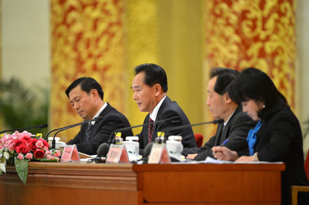 11月7日,中國(guó)共產(chǎn)黨第十八次全國(guó)代表大會(huì)新聞中心在北京舉行首次新聞發(fā)布會(huì)。這是大會(huì)新聞發(fā)言人蔡名照(左二)在介紹情況。