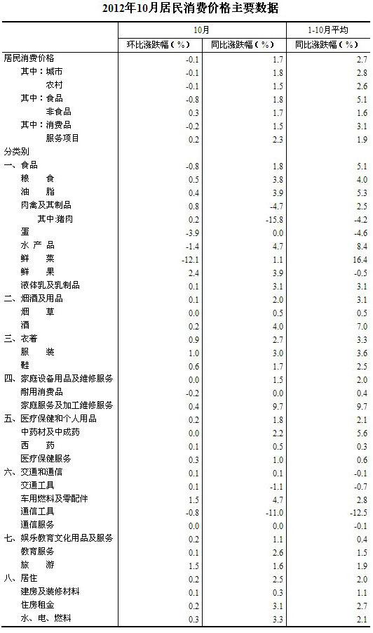 2012年10月份,全國居民消費價格總水平同比上漲1.7%(創(chuàng)33個月以來新低)。其中,城市上漲1.8%,農(nóng)村上漲1.5%;食品價格上漲1.8%,非食品價格上漲1.7%;消費品價格上漲1.5%,服務(wù)項目價格上漲2.3%。1-10月平均,全國居民消費價格總水平比去年同期上漲2.7%。