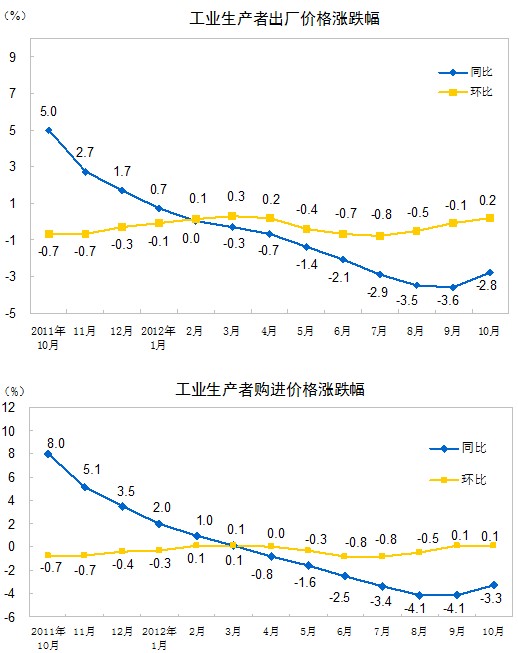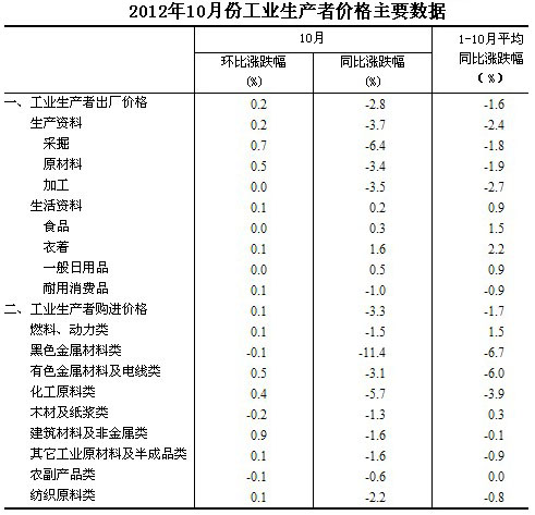 2012年10月份,全國工業(yè)生產(chǎn)者出廠價格同比下降2.8%,環(huán)比上漲0.2%。工業(yè)生產(chǎn)者購進價格同比下降3.3%,環(huán)比上漲0.1%。1—10月平均,工業(yè)生產(chǎn)者出廠價格同比下降1.6%,工業(yè)生產(chǎn)者購進價格同比下降1.7%。