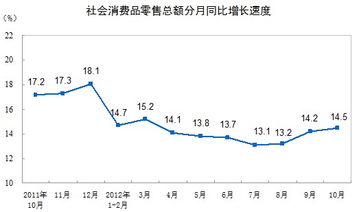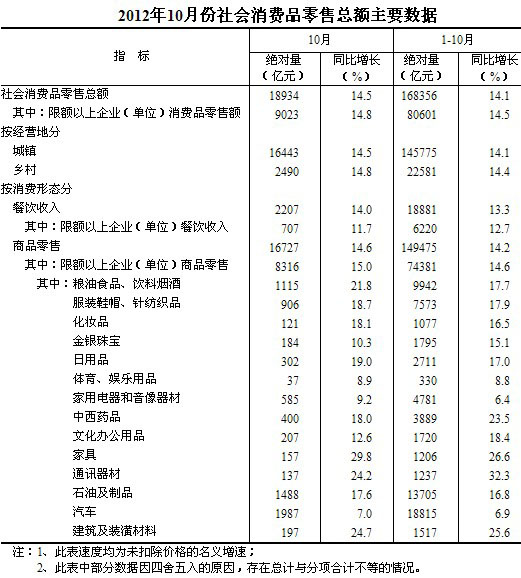 2012年10月份,社會(huì)消費(fèi)品零售總額18934億元,同比名義增長14.5%(扣除價(jià)格因素實(shí)際增長13.5%,以下除特殊說明外均為名義增長)。其中,限額以上企業(yè)(單位)消費(fèi)品零售額9023億元,增長14.8%。1-10月份,社會(huì)消費(fèi)品零售總額168356億元,同比名義增長14.1%(扣除價(jià)格因素實(shí)際增長11.8%)。從環(huán)比看,10月份社會(huì)消費(fèi)品零售總額增長1.34%。
