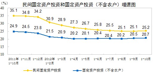 2012年1-10月份,全國民間固定資產(chǎn)投資180997億元,同比名義增長25.2%,增速比1-9月份加快0.1個百分點。民間固定資產(chǎn)投資占固定資產(chǎn)投資的比重為61.9%,比1-9月份下降0.1個百分點。