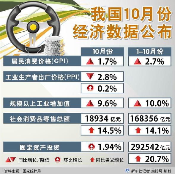 國家統(tǒng)計局數(shù)據(jù)顯示,10月份,消費增速為14.5%,較9月份回升0.3個百分點;規(guī)模以上工業(yè)增加值同比增長9.6%,比9月份加快0.4個百分點;而前10個月固定資產(chǎn)投資累計增速為20.7%,較1-9月份加快0.2個百分點。