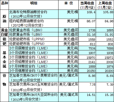 國際大宗商品期貨價(jià)格明細(xì)表[2012-11-12]