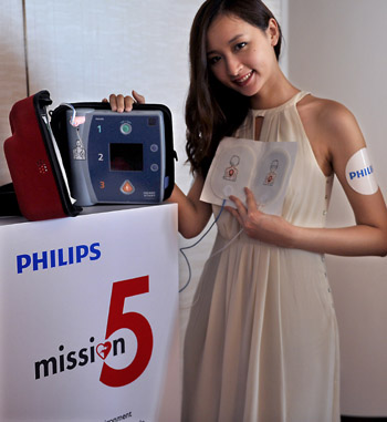 荷蘭飛利浦公司目前在香港推出新研發(fā)的自動調(diào)控溫度的電熨斗、藍(lán)牙無線遙控高保真音響系統(tǒng)、用于心臟病急救的家用體外自動除顫器等一批家電用品。圖為一名模特在現(xiàn)場展示飛利浦的體外自動除顫器。記者