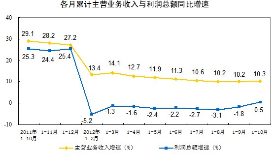 1-10月份,全國規(guī)模以上工業(yè)企業(yè)實(shí)現(xiàn)利潤40240億元,同比增長0.5%。10月當(dāng)月實(shí)現(xiàn)利潤5001億元,同比增長20.5%。