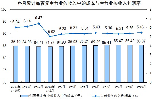 規(guī)模以上工業(yè)企業(yè)實(shí)現(xiàn)主營業(yè)務(wù)收入736970億元,同比增長10.3%。每百元主營業(yè)務(wù)收入中的成本為85.37元,主營業(yè)務(wù)收入利潤率為5.46%。