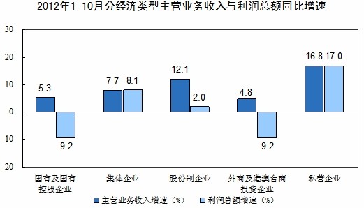 1-10月份,在規(guī)模以上工業(yè)企業(yè)中,國有及國有控股企業(yè)實(shí)現(xiàn)利潤11270億元,同比下降9.2%;集體企業(yè)實(shí)現(xiàn)利潤630億元,同比增長8.1%;股份制企業(yè)實(shí)現(xiàn)利潤23526億元,同比增長2%;外商及港澳臺商投資企業(yè)實(shí)現(xiàn)利潤9195億元,同比下降9.2%;私營企業(yè)實(shí)現(xiàn)利潤12623億元,同比增長17%。