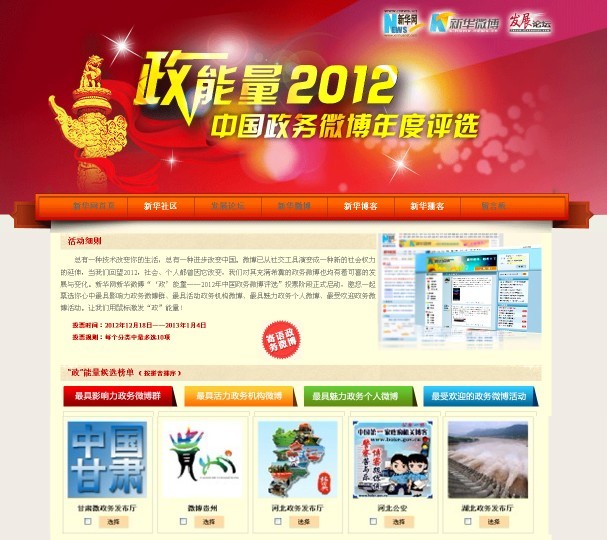 微博已從社交工具演變成一種新的社會權(quán)力的延伸,當(dāng)我們回望2012,社會、個人都曾因它改變,我們對其充滿希冀的政務(wù)微博也均有著可喜的發(fā)展與變化。本次活動投票期為2012年12月18日——2013年1月4日,網(wǎng)友可登錄新華網(wǎng)(