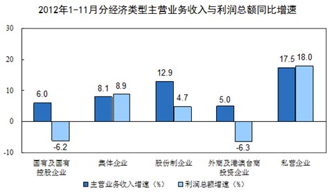 1-11月份在規(guī)模以上工業(yè)企業(yè)中,國有及國有控股企業(yè)實現(xiàn)利潤12585億元,同比下降6.2%;集體企業(yè)實現(xiàn)利潤711億元,同比增長8.9%;股份制企業(yè)實現(xiàn)利潤27304億元,同比增長4.7%;外商及港澳臺商投資企業(yè)實現(xiàn)利潤10731億元,同比下降6.3%;私營企業(yè)實現(xiàn)利潤14946億元,同比增長18%。