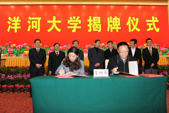 12月26日上午,洋河大學(xué)揭牌儀式在南京隆重舉行,江蘇省有關(guān)領(lǐng)導(dǎo)出席儀式,并與江蘇洋河酒廠股份有限公司(蘇酒集團)董事長、總裁張雨柏共同為洋河大學(xué)揭牌。江蘇省企業(yè)大學(xué)創(chuàng)建工程領(lǐng)導(dǎo)小組辦公室主任吳強和蘇酒集團副總裁林青簽署戰(zhàn)略合作協(xié)議。南京大學(xué)商學(xué)院名譽院長、教授、博士生導(dǎo)師、江蘇省企業(yè)大學(xué)創(chuàng)建專家委員會主任趙曙明,江蘇省相關(guān)單位領(lǐng)導(dǎo)、省內(nèi)各市經(jīng)信委等相關(guān)單位領(lǐng)導(dǎo)和企業(yè)大學(xué)創(chuàng)建專家委員會專家、已建企業(yè)大學(xué)代表等參加了揭牌儀式。江蘇省經(jīng)信委黨組成員、江蘇省中小企業(yè)局副局長、江蘇省鄉(xiāng)鎮(zhèn)企業(yè)局副局長張樂夫主持揭牌儀式。