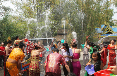 潑水節(jié)有浴佛、過年、祈雨、迎春耕、祝愿六畜興旺和五谷豐登之意。節(jié)期固定為陽歷4月12日至14日。節(jié)期內(nèi)人們互相潑水祝福,唱歌跳舞,放孔明燈等。傣族、德昂族及阿昌族認(rèn)為,潑水可消災(zāi)祛病,吉祥如意。