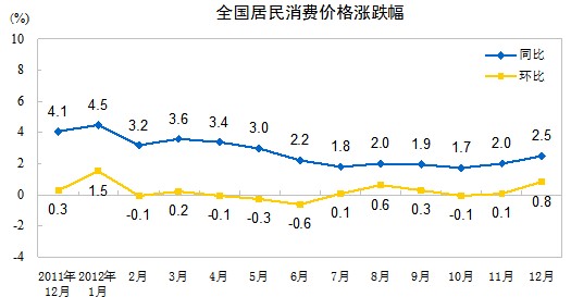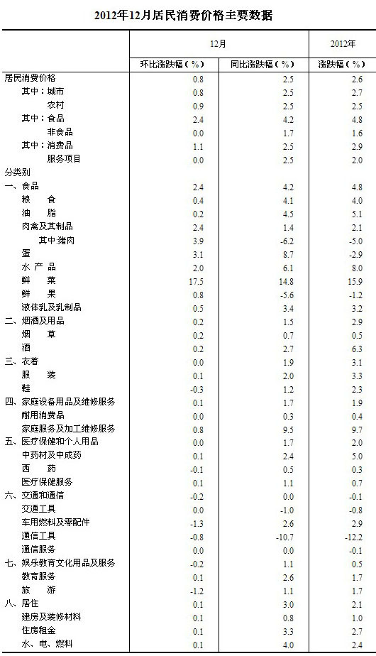 2012年12月份,全國居民消費(fèi)價(jià)格總水平同比上漲2.5%。其中,城市上漲2.5%,農(nóng)村上漲2.5%;食品價(jià)格上漲4.2%,非食品價(jià)格上漲1.7%;消費(fèi)品價(jià)格上漲2.5%,服務(wù)項(xiàng)目價(jià)格上漲2.5%。2012年,全國居民消費(fèi)價(jià)格總水平比上年上漲2.6%。