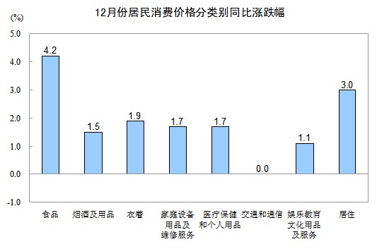 12月份,食品價(jià)格同比上漲4.2%,影響居民消費(fèi)價(jià)格總水平同比上漲約1.37個(gè)百分點(diǎn)。其中,鮮菜價(jià)格上漲14.8%,影響居民消費(fèi)價(jià)格總水平上漲約0.41個(gè)百分點(diǎn);水產(chǎn)品價(jià)格上漲6.1%,影響居民消費(fèi)價(jià)格總水平上漲約0.15個(gè)百分點(diǎn);糧食價(jià)格上漲4.1%,影響居民消費(fèi)價(jià)格總水平上漲約0.12個(gè)百分點(diǎn);肉禽及其制品價(jià)格上漲1.4%,影響居民消費(fèi)價(jià)格總水平上漲約0.11個(gè)百分點(diǎn)(豬肉價(jià)格下降6.2%,影響居民消費(fèi)價(jià)格總水平下降約0.22個(gè)百分點(diǎn));油脂價(jià)格上漲4.5%,影響居民消費(fèi)價(jià)格總水平上漲約0.06個(gè)百分點(diǎn);鮮果價(jià)格下降5.6%,影響居民消費(fèi)價(jià)格總水平下降約0.11個(gè)百分點(diǎn)。