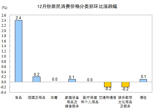 12月份,全國居民消費(fèi)價(jià)格總水平環(huán)比上漲0.8%。其中,城市上漲0.8%,農(nóng)村上漲0.9%;食品價(jià)格上漲2.4%,非食品價(jià)格持平(漲跌幅度為0);消費(fèi)品價(jià)格上漲1.1%,服務(wù)項(xiàng)目價(jià)格持平。