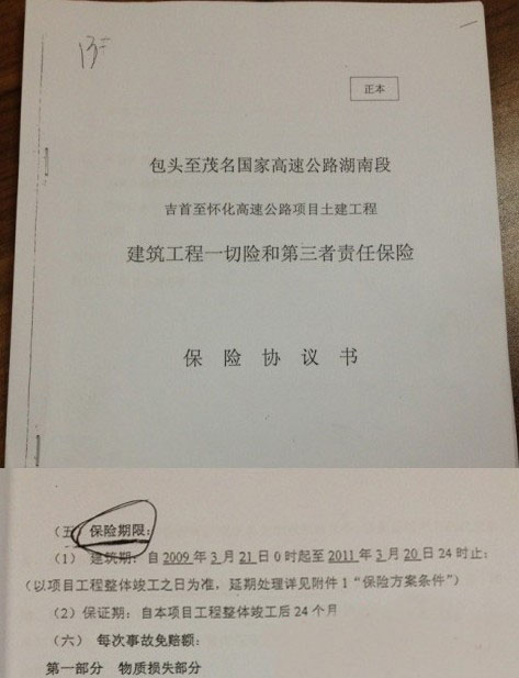 而雙方協(xié)議中規(guī)定的兩年保證期,被張曉萌忽略。他只告訴記者,湖南PICC參與了省內(nèi)大部分高速公路建筑工程項(xiàng)目一切險(xiǎn)及第三者責(zé)任險(xiǎn)的承保工作。