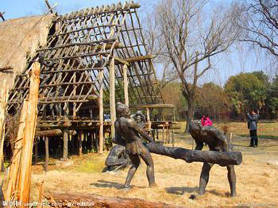 河姆渡遺址位于余姚市河姆渡鎮(zhèn)金吾廟村。它是1973年夏天當?shù)剞r(nóng)民建造排澇站時發(fā)現(xiàn)的,總面積約4萬平方米,自下而上疊壓著4個文化層,根據(jù)北京大學(xué)碳14實驗室測定,第四文化層距今約7000-6500年,第三文化層距今約6500-6000年,第二文化層距今約6000-5500年,第一文化層距今約5500-5000年。該遺址于1973年和1977年冬進行過兩次考古發(fā)掘,合計面積2630平方米,出土生產(chǎn)工具、生活器具、原始藝術(shù)品等文物6700余件,還發(fā)現(xiàn)豐富的栽培稻谷和大面積的木建筑遺跡、捕獵的野生動物和家養(yǎng)動物的骨骸、采集的植物果實及少量的墓葬等遺存。所有這些,為研究中國遠古時代的農(nóng)業(yè)、建筑、制陶、紡織、藝術(shù)和東方文明的起源以及古地理、古氣候、古水文的演變提供了極其珍貴的實物資料。河姆渡遺址第一、第二文化層的出土文物與浙江省內(nèi)湖州邱城遺址下層及嘉興市郊馬家濱遺址的器物相似,第三、第四文化層的出土文物,在浙江則是新發(fā)現(xiàn),而且它已擁有較為發(fā)達的耜耕農(nóng)業(yè)、采用榫卯技術(shù)的干欄式建筑,在國內(nèi)同時代的遺址中,它的生產(chǎn)、生活水平處于領(lǐng)先地位,因此是一支全新的考古學(xué)文化,故命名為河姆渡文化。