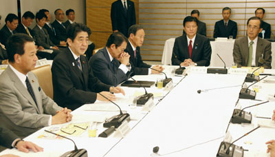 5日,日本央行行長白川方明(右)與日本首相安倍晉三(左二)參加在首相官邸舉行的經(jīng)濟財政咨詢會議。