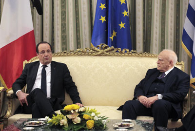 法國總統(tǒng)奧朗德19日出訪希臘,在雅典與希臘總統(tǒng)卡羅洛斯·帕普利亞斯舉行會談。奧朗德表示,單純依靠緊縮措施,財(cái)政改革無法取得成功。他認(rèn)為,確保經(jīng)濟(jì)恢復(fù)增長應(yīng)是歐洲國家的優(yōu)先議程。