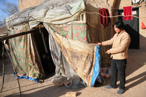因?yàn)閾?dān)心被石油勘探放炮震裂的窯洞坍塌,鎮(zhèn)原縣平泉鎮(zhèn)姚川村村民常小萍一直住在這頂自家用塑料、破布搭的簡易帳篷里,直到大年除夕市縣領(lǐng)導(dǎo)送來一頂新帳篷。 |