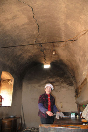 “俺們先后找了鎮(zhèn)上、縣上,接待俺們的領(lǐng)導(dǎo)都說‘再等等,還有比你嚴(yán)重的’!币Υù宕迕癜簿S全告訴記者,他家的窯洞裂縫很大,從窯口一直延伸到窯后,一家四口先是害怕,在院里搭帳篷住,后來冷得實(shí)在受不了,又搬進(jìn)了危窯。