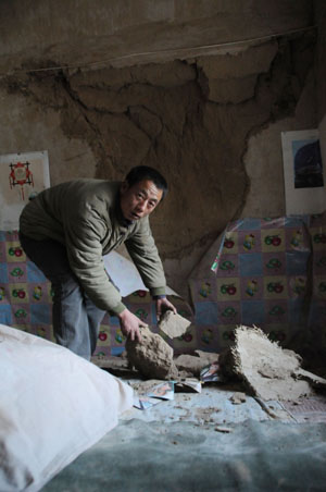 鎮(zhèn)原縣許多農(nóng)民的窯洞被石油勘探放炮震裂了,整個(gè)春節(jié)過得提心吊膽。圖為平泉鎮(zhèn)洪水村村民焦武合在收拾震塌的窯洞。(本版照片均由記者王艷明攝) |