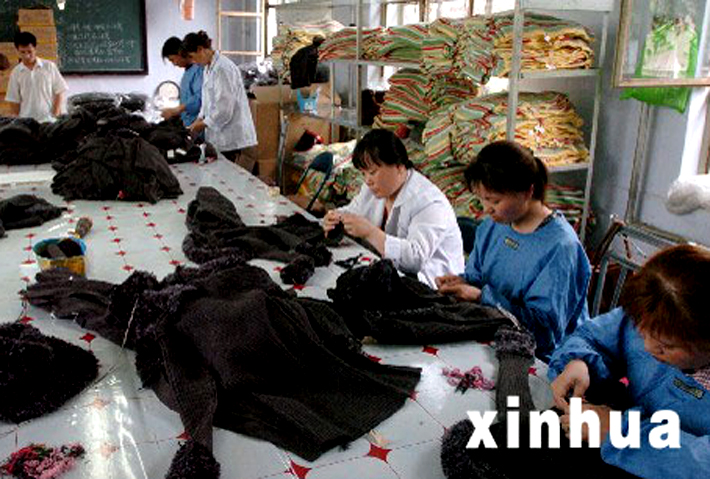 2005年7月14日,遼寧省阜新市萬(wàn)華工藝編織有限公司的職工在織毛衣。新華社記者攝 |