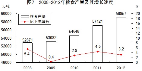 全年糧食產(chǎn)量58957萬(wàn)噸,比上年增加1836萬(wàn)噸,增產(chǎn)3.2%。其中,夏糧產(chǎn)量12995萬(wàn)噸,增產(chǎn)2.8%;早稻產(chǎn)量3329萬(wàn)噸,增產(chǎn)1.6%;秋糧產(chǎn)量42633萬(wàn)噸,增產(chǎn)3.5%。其中,主要糧食品種中,稻谷產(chǎn)量20429萬(wàn)噸,增產(chǎn)1.6%;小麥產(chǎn)量12058萬(wàn)噸,增產(chǎn)2.7%;玉米產(chǎn)量20812萬(wàn)噸,增產(chǎn)8.0%。