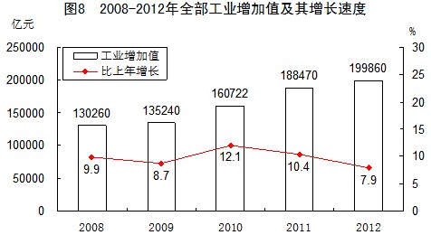 全年規(guī)模以上工業(yè)[7]中,農(nóng)副食品加工業(yè)增加值比上年增長(zhǎng)13.6%,紡織業(yè)增長(zhǎng)12.2%,通用設(shè)備制造業(yè)增長(zhǎng)8.4%,專用設(shè)備制造業(yè)增長(zhǎng)8.9%,汽車(chē)制造業(yè)增長(zhǎng)8.4%,計(jì)算機(jī)、通信和其他電子設(shè)備制造業(yè)增長(zhǎng)12.1%,電氣機(jī)械和器材制造業(yè)增長(zhǎng)9.7%。六大高耗能行業(yè)[8]增加值比上年增長(zhǎng)9.5%,其中,非金屬礦物制品業(yè)增長(zhǎng)11.2%,化學(xué)原料和化學(xué)制品制造業(yè)增長(zhǎng)11.7%,有色金屬冶煉和壓延加工業(yè)增長(zhǎng)13.2%,黑色金屬冶煉和壓延加工業(yè)增長(zhǎng)9.5%,電力、熱力生產(chǎn)和供應(yīng)業(yè)增長(zhǎng)5.0%,石油加工、煉焦和核燃料加工業(yè)增長(zhǎng)6.3%。高技術(shù)制造業(yè)增加值比上年增長(zhǎng)12.2%。