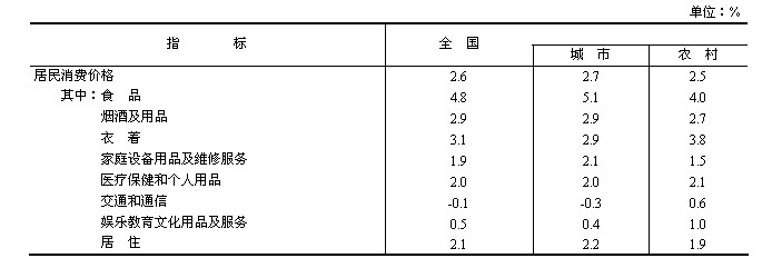 全年居民消費(fèi)價(jià)格比上年上漲2.6%,其中食品價(jià)格上漲4.8%。固定資產(chǎn)投資價(jià)格上漲1.1%。工業(yè)生產(chǎn)者出廠價(jià)格下降1.7%。工業(yè)生產(chǎn)者購進(jìn)價(jià)格下降1.8%。農(nóng)產(chǎn)品生產(chǎn)者價(jià)格[3]上漲2.7%。