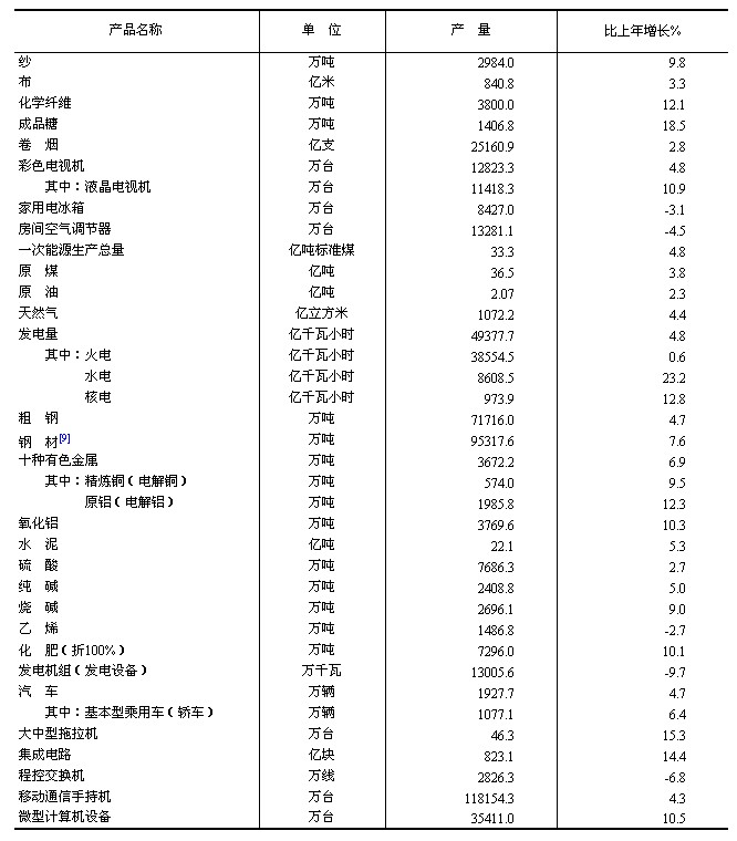 全年規(guī)模以上工業(yè)[7]中,農(nóng)副食品加工業(yè)增加值比上年增長13.6%,紡織業(yè)增長12.2%,通用設(shè)備制造業(yè)增長8.4%,專用設(shè)備制造業(yè)增長8.9%,汽車制造業(yè)增長8.4%,計(jì)算機(jī)、通信和其他電子設(shè)備制造業(yè)增長12.1%,電氣機(jī)械和器材制造業(yè)增長9.7%。六大高耗能行業(yè)[8]增加值比上年增長9.5%,其中,非金屬礦物制品業(yè)增長11.2%,化學(xué)原料和化學(xué)制品制造業(yè)增長11.7%,有色金屬冶煉和壓延加工業(yè)增長13.2%,黑色金屬冶煉和壓延加工業(yè)增長9.5%,電力、熱力生產(chǎn)和供應(yīng)業(yè)增長5.0%,石油加工、煉焦和核燃料加工業(yè)增長6.3%。高技術(shù)制造業(yè)增加值比上年增長12.2%。