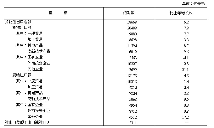 全年貨物進(jìn)出口總額38668億美元,比上年增長6.2%。其中,出口20489億美元,增長7.9%;進(jìn)口18178億美元,增長4.3%。進(jìn)出口差額(出口減進(jìn)口)2311億美元,比上年增加762億美元。
