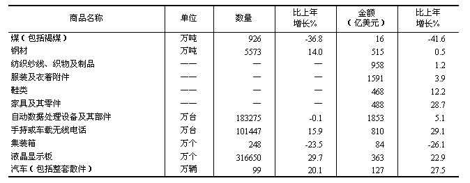 表7 2012年主要商品出口數(shù)量、金額及其增長速度