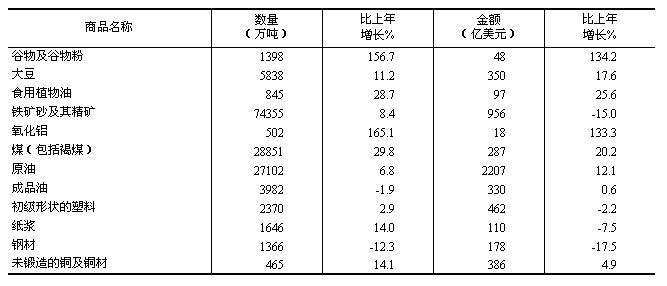 表8 2012年主要商品進(jìn)口數(shù)量、金額及其增長速度