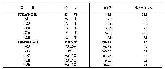 全年貨物運(yùn)輸總量412億噸,比上年增長11.5%。貨物運(yùn)輸周轉(zhuǎn)量173145億噸公里,增長8.7%。全年規(guī)模以上港口完成貨物吞吐量97.4億噸,比上年增長6.8%,其中外貿(mào)貨物吞吐量30.1億噸,增長8.8%。規(guī)模以上港口集裝箱吞吐量17651萬標(biāo)準(zhǔn)箱,增長8.1%。